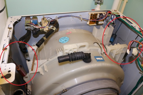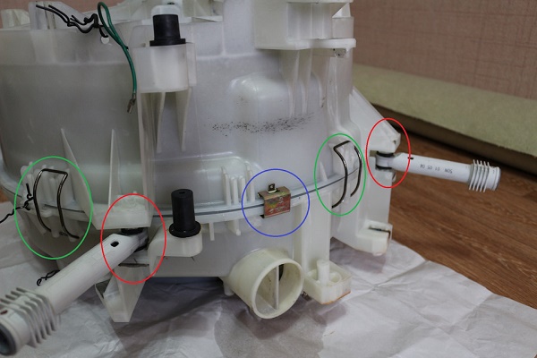 Wir haben die obigen Schritte unternommen, um den Tank mit der Trommel der Waschmaschine aus dem Gehäuse zu entfernen, da das Wechseln der Stoßdämpfer in solchen Modellen ohne diesen Schritt nicht funktioniert. Als nächstes werden wir uns mit der Verschiebung befassen, d.h. Nehmen Sie die Trommel heraus, schrauben Sie die abgenutzten Dämpfungsvorrichtungen ab und setzen Sie neue ein.