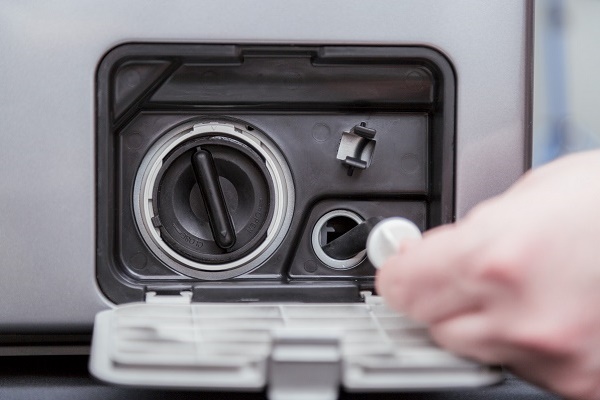 Dann Spülen Sie den Filter unter fließendem Wasser. Schauen Sie in das Loch, dort sammelt sich oft Müll, Reste von Fäden, Wolle, Haaren und mehr. All dies muss von Hand entfernt werden. Um besser sehen zu können, zünde dir eine Taschenlampe an. Setzen Sie den Filter wieder ein, schrauben Sie ihn ein und setzen Sie die Frontplatte ein.
