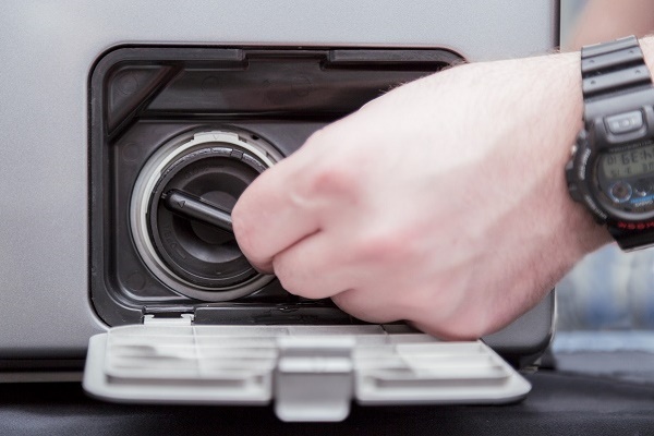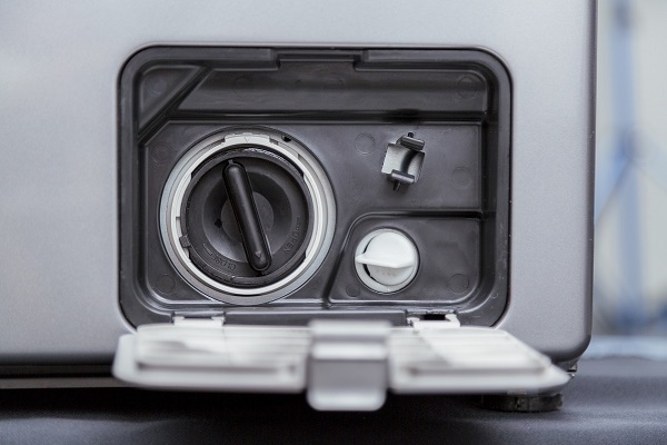 Sie sehen einen Gummi- oder Plastikkorken vor sich. Es sollte abgeschraubt werden. Sie können dies mit bloßen Händen tun, indem Sie den Korken mehrmals gegen den Uhrzeigersinn drehen.