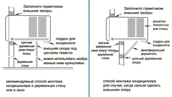 Damit die Luftaufnahme vollständig ist, sollte sich praktisch ein Drittel des Geräts oder sogar die Hälfte davon außerhalb der umschließenden Struktur befinden. Das heißt, die Installation sollte so erfolgen, dass sich das Lufteinlassgitter vollständig hinter der Wand oder dem Fensterrahmen befindet. Infolgedessen befindet sich der gewichtige Teil des Körpers außerhalb.