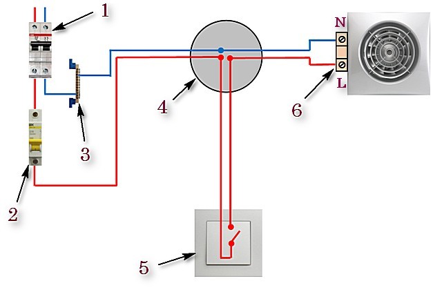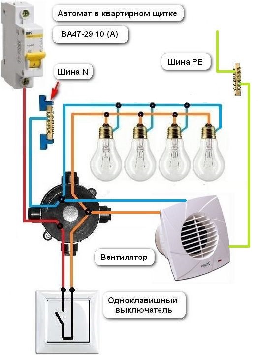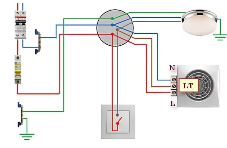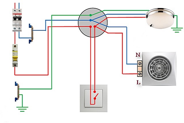 Nach dem Kauf Abluftventilator zum Badezimmer Es stellt sich die Frage nach der Installation und dem Anschluss an das Stromnetz. Es gibt also viele Möglichkeiten, einen Lüfter einzuschalten, aber zwei Schemata werden als zweckmäßig erkannt: Anschließen eines Abluftventilators über einen Ein-Schlüssel-Schalter und Koppeln mit einem Zwei-Schlüssel-Gerät. Jedes der Schemata kann in zwei Versionen ausgeführt werden, die vom Typ der Abgasvorrichtung abhängen - mit oder ohne Zeitgeber.