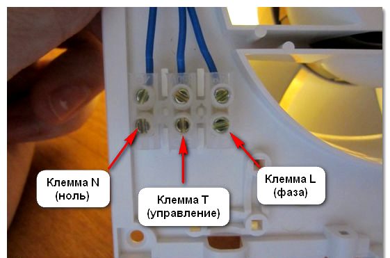 Beim Anschließen eines Lüfters folgen sowohl „Null“ als auch „Phase“ von der Anschlussdose ohne Unterbrechung den Lüfteranschlüssen. Und das Gerät ist durch eine andere "Phase" mit dem Schalter verbunden. Diese Phase muss mit dem LT-Anschluss verbunden werden - dem „Phasen“ -Kontakt des Timers.