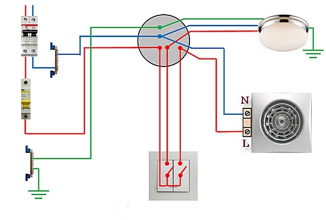 Betrachten wir nun eine Option, die etwas schwieriger zu verbinden, aber viel einfacher zu verwenden ist - mit einem 2-Tasten-Schalter. Im Angebot finden Sie speziell für diesen Zweck hergestelltes Verkabelungszubehör, das Lüftungs- und Beleuchtungskreise kombiniert.