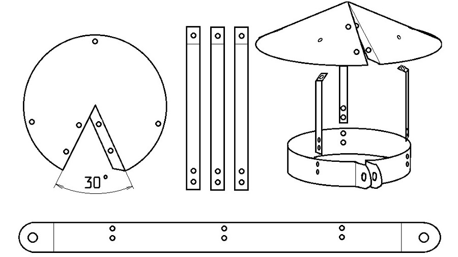 Sie können einen solchen Regenschirm für Lüftungsrohre aus jedem Material und jeder Größe herstellen. Um den Regenschirm zu installieren, muss er mit einer Klemme am Rohrkopf befestigt und mit einer Spannschraube und einer Mutter festgezogen werden.