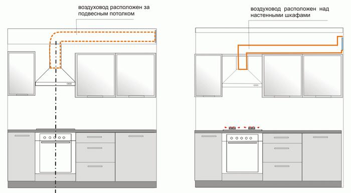 Wenn es auf der gegenüberliegenden Seite installiert ist, ist es besser, es näher zu bewegen, als den Kanal durch die gesamte Küche zu ziehen.