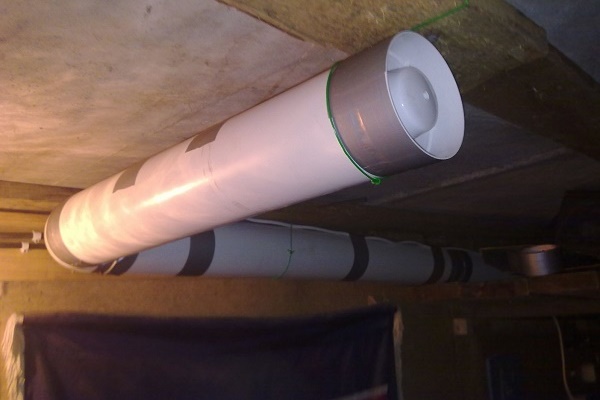 Normalerweise für Zwecke unterirdische Belüftung Verwenden Sie zwei Rohre, von denen eines für den Luftstrom und das zweite für den Auspuff arbeitet. Die Verwendung eines einzelnen Rohrs führt zu einem viel geringeren Umluftvolumen.