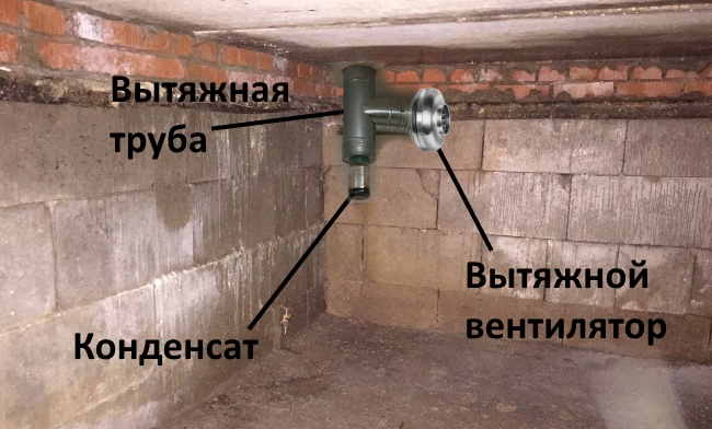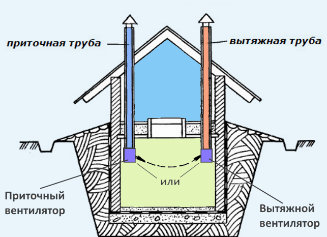 Die natürliche Belüftung funktioniert im Sommer nicht gut und entfernt auch lange Zeit Gase mit einem spezifischen Gewicht, das höher ist als das der normalen Luft. In diesem Fall entsteht ein Luftdruckaufbau Zwangsbelüftung durch Einbau von Axialventilatoren.
