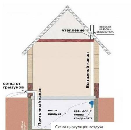 In den allermeisten Fällen wird die natürliche Belüftung kleiner unterirdischer Räume genutzt. Im Winter basiert die Physik des Luftmassenumlaufprozesses auf dem Dichteunterschied zwischen kalter und warmer Luft. Zu diesem Zweck befindet sich der Auslass des Versorgungsrohrs näher am Boden und der Eingang zum Auspuffrohr befindet sich unter der Decke.