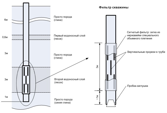 Unter solchen Bedingungen ist die Pumpe überlastet und fällt sehr schnell aus. Darüber hinaus stützt der Filter die Wände des Brunnens und schützt sie vor dem Einsturz und dem Abwerfen von Gestein.