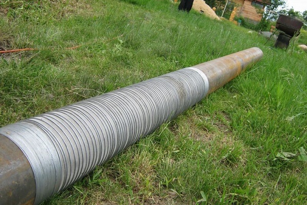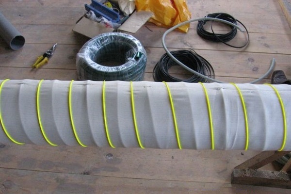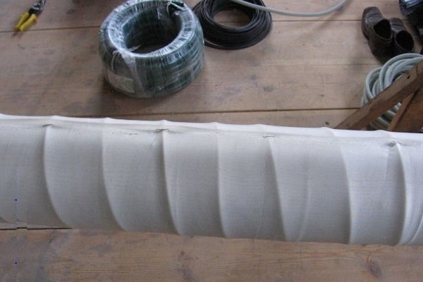 - Über der Perforation legen wir den Draht auf. Wir wickeln es mit einer Neigung von 30-45 °, während der Abstand zwischen benachbarten Windungen 2 ± 0,5 cm betragen sollte. Alle 5-10 cm führen wir Punktlöten durch und befestigen den Draht an der Basis.