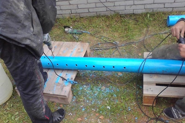 Ihre Anzahl wird im Verhältnis 1: 4 gewählt, dh der vierte Teil des gesamten Rohrs sollte perforiert sein. Die Löcher werden mit einem Mindestabstand von 2-3 cm platziert.