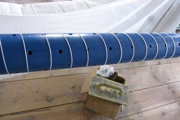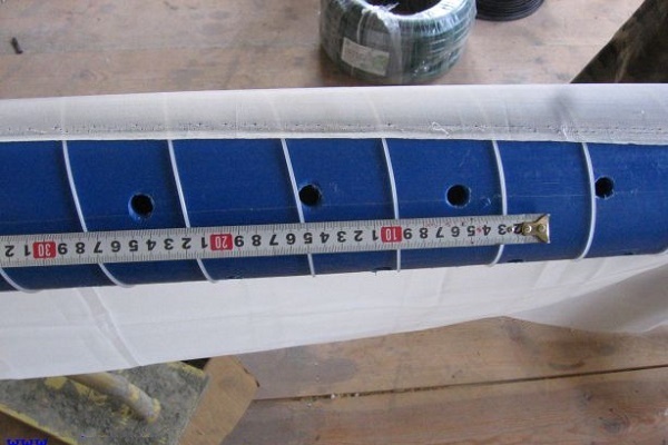 - Wir legen das Rohr auf eine horizontale Fläche und fahren mit der Markierung fort. An einem Ende sehen wir die Länge des Sumpfes von ca. 50 cm. Direkt dahinter befindet sich das Filterteil, an dem wir die Löcher markieren. Vergessen Sie nicht, dass es ¼ des gesamten Rohrs einnimmt.