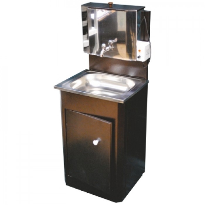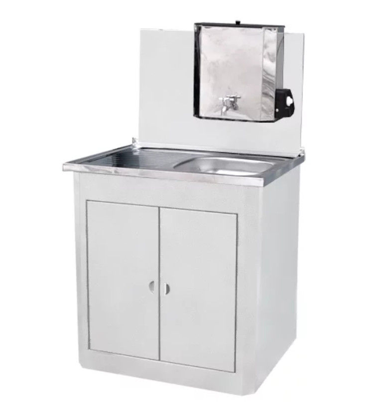 Eine detaillierte Übersicht über ein beheiztes Gerät mit einem Schrank und einem Edelstahlspülbecken. Interessante Nuancen des Produkts: