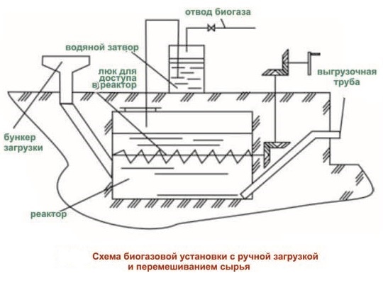 Dans les installations domestiques, des conteneurs séparés sont utilisés pour préparer le substrat, où les déchets sont broyés et mélangés avec de l'eau. Ensuite, la masse est chargée dans le compartiment récepteur. Dans les réacteurs situés sous terre, la trémie de réception du substrat est sortie, le mélange préparé par gravité s'écoule à travers le pipeline dans la chambre pour la fermentation.