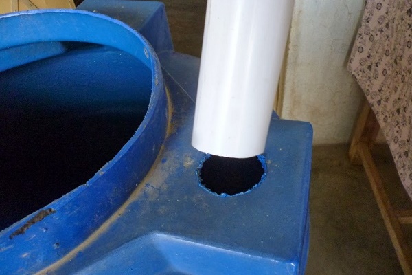 Le tuyau de sortie d'un diamètre d'environ 7 cm doit être presque au fond de la trémie, son autre extrémité est montée dans un récipient de compensation de forme rectangulaire, dans lequel les déchets seront pompés. La canalisation d'alimentation du substrat est située à environ 50 cm du fond et a un diamètre de 25 à 35 cm La partie supérieure du tuyau pénètre dans le compartiment pour recevoir les matières premières.