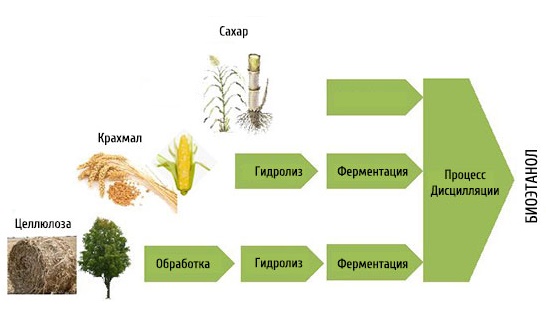 Pour la production industrielle d'éthanol, la base des biocarburants, les technologies d'hydratation (hydrolyse) ou de fermentation sont utilisées. Dans le premier cas, l'alcool est obtenu à partir de cellulose. Comme matière première, la paille ou le bois est utilisé ici.