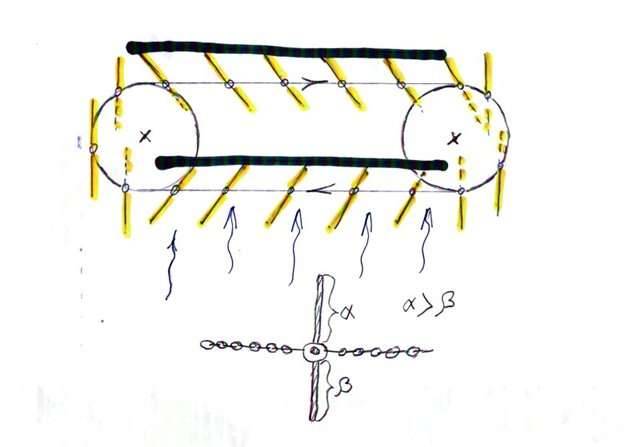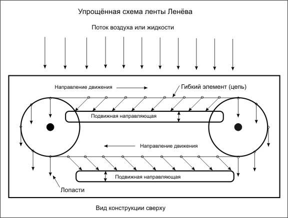 La conception se compose d'une chaîne de rotors montés sur un câble en acier flexible, tiré à travers la rivière. Le câble lui-même joue le rôle d'un arbre de rotation, dont une extrémité est fixée sur le palier support, et l'autre active l'arbre du générateur.