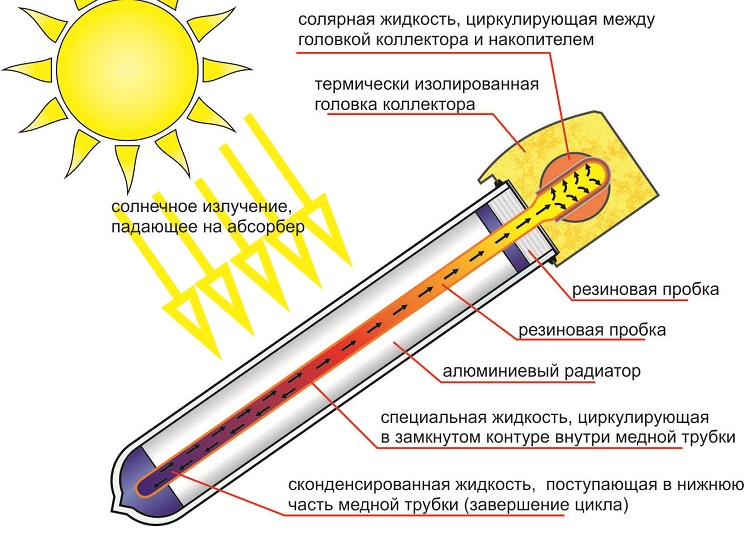 Selon la méthode de transfert de chaleur, il existe deux systèmes: à passage unique et avec caloduc. Le thermotube est un récipient scellé avec un liquide volatil.