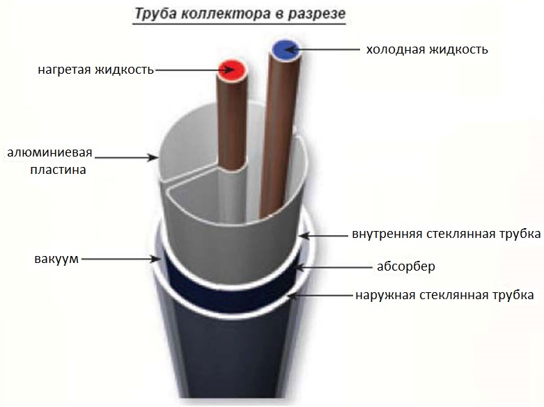 Le tube coaxial est un récipient Dyayur ou un thermos familier. Composé de deux flacons entre lesquels l'air est pompé. Un revêtement hautement sélectif qui absorbe efficacement l'énergie solaire est appliqué sur la surface intérieure de l'ampoule intérieure.