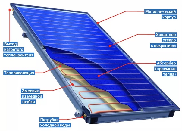 Le collecteur plat se compose d'un cadre en aluminium, d'une couche absorbante spéciale - un absorbeur, un revêtement transparent, une canalisation et un réchauffeur.