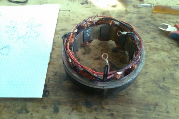 Dans les appareils pour éoliennes, un enroulement statorique triphasé (connexion en étoile) est fourni, d'où trois fils vont au contrôleur, où la tension alternative est transformée en tension continue.