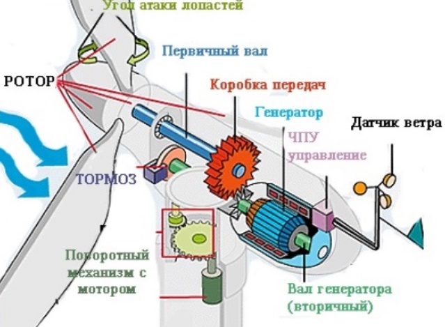 L'électricité générée, en règle générale, va directement au réseau, tandis que pour la stabilité et la régulation de la fréquence de rotation des pales de l'éolienne sont équipées de mécanismes supplémentaires.