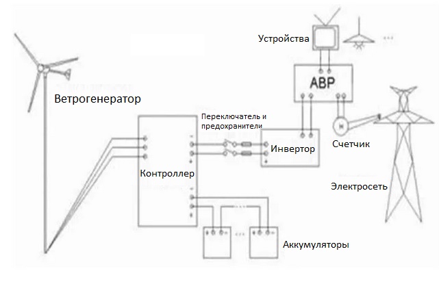 Travail hors ligne. Dans ce cas, une seule installation est définie, à l'aide de laquelle l'énergie éolienne est captée et accumulée, qui est ensuite convertie en un courant électrique dont les consommateurs ont besoin.
