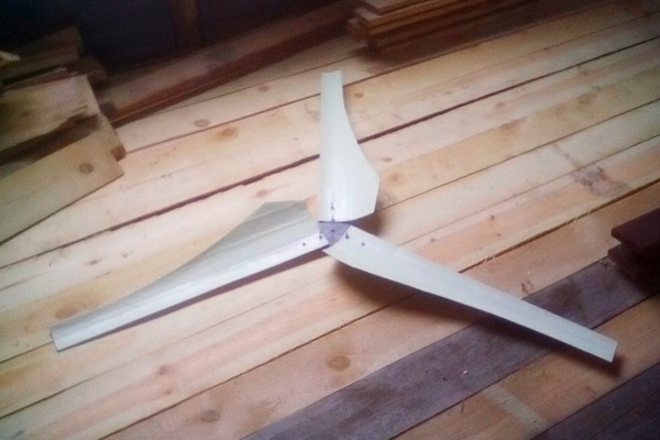 Une hélice à trois pales de cette forme peut être utilisée pour des unités plus puissantes, environ 150 W à 12 V. Le diamètre de l'hélice entière dans ce modèle atteint 1,5 m. La roue éolienne tournera rapidement et commencera facilement à se déplacer. Les éoliennes à trois ailes sont les plus courantes dans les centrales électriques domestiques.