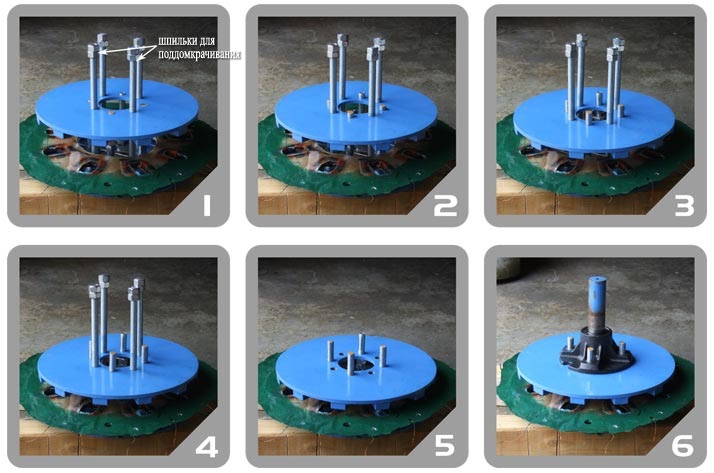 À l'aide d'une clé, les goujons sont tournés alternativement de sorte que le rotor supérieur descend vers le rotor inférieur de manière uniforme et sans à-coups. Lorsqu'il prend sa place, les plots sont tordus et les plaques en aluminium sont retirées. À la fin, toute la structure est fixée avec des écrous et serrez-les clairement, mais pas trop pour ne pas casser le fil.