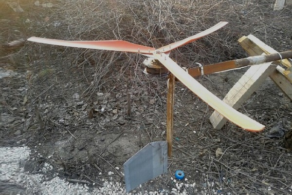La conception de la girouette, à une extrémité de laquelle il y a une place pour un générateur de voiture avec une vis, et à l'autre - une place pour une «tige», est recommandée pour être faite d'un matériau durable léger.