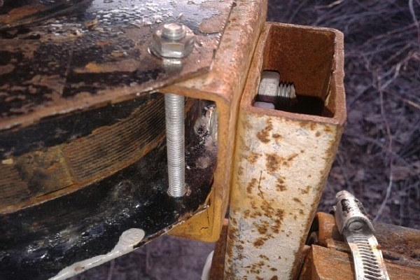 Cette partie - sous la forme d'un long boulon (250-300 mm), d'un diamètre d'environ 30 mm (calculé), traverse le corps du tube profilé en aluminium et est fixée avec un écrou par le bas. Un contre-écrou est placé sur le dessus de l'écrou.