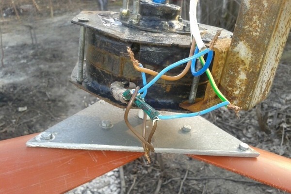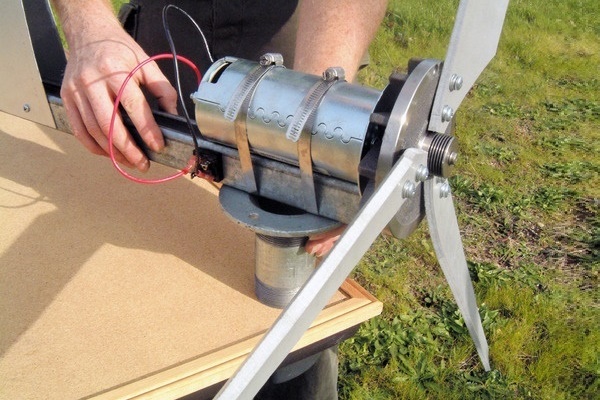 Vous devez maintenant fixer le godet avec les lames préparées pour le travail sur la poulie. Nous installons le générateur sur le mât, le fixant avec des pinces. Reste à connecter les fils et à assembler le circuit. Préparez-vous à enregistrer le schéma de câblage, les couleurs des fils et les repères des broches. Plus tard, cela sera certainement utile. Nous fixons les fils sur le mât de l'appareil.