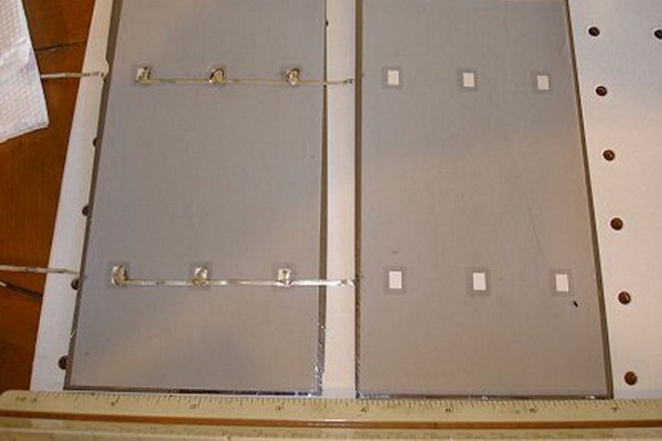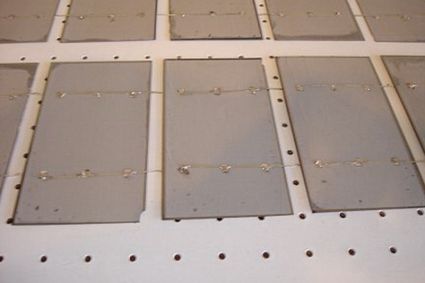 - Nous retournons les chaînes résultantes avec les photocellules face vers le haut (là où se trouvent les plaques bleues) et plaçons les plaques en fonction des marquages appliqués précédemment. Appuyez soigneusement sur chaque plaque pour la verrouiller en place.