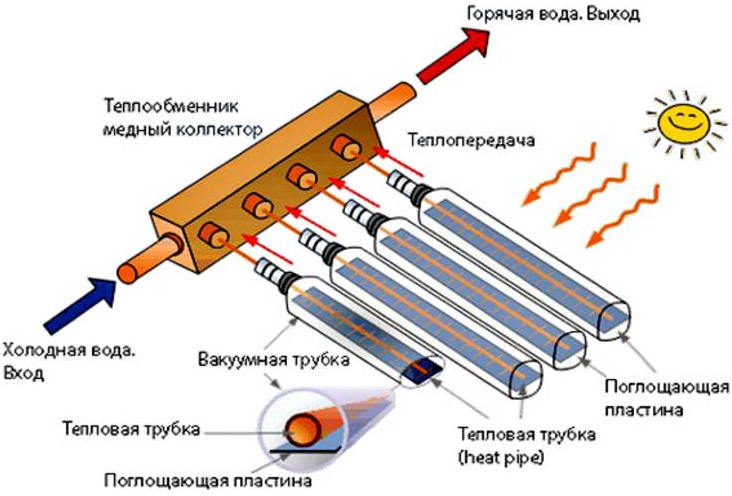 Les canaux de chaleur d'un caloduc sont constitués de tubes fermés contenant une composition liquide facilement volatile. Sous l'influence de la lumière du soleil, il se réchauffe, passe dans la région supérieure du canal et s'y concentre dans un collecteur de chaleur spécial (collecteur).