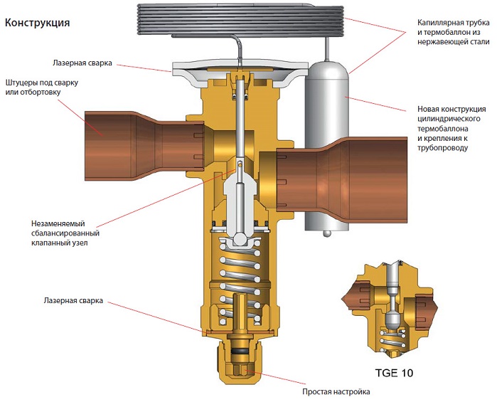 Ces éléments peuvent devenir inutilisables à des températures élevées. Par conséquent, pendant les travaux de soudage, la vanne doit être isolée avec un chiffon en amiante. La soupape de commande doit correspondre à la capacité de l'évaporateur.