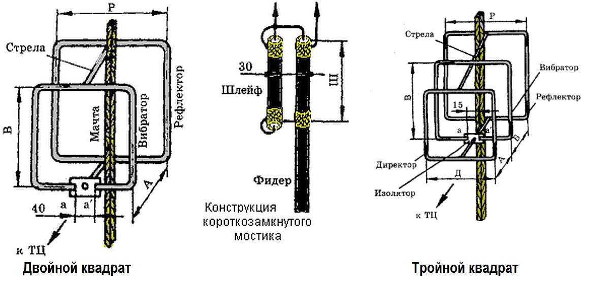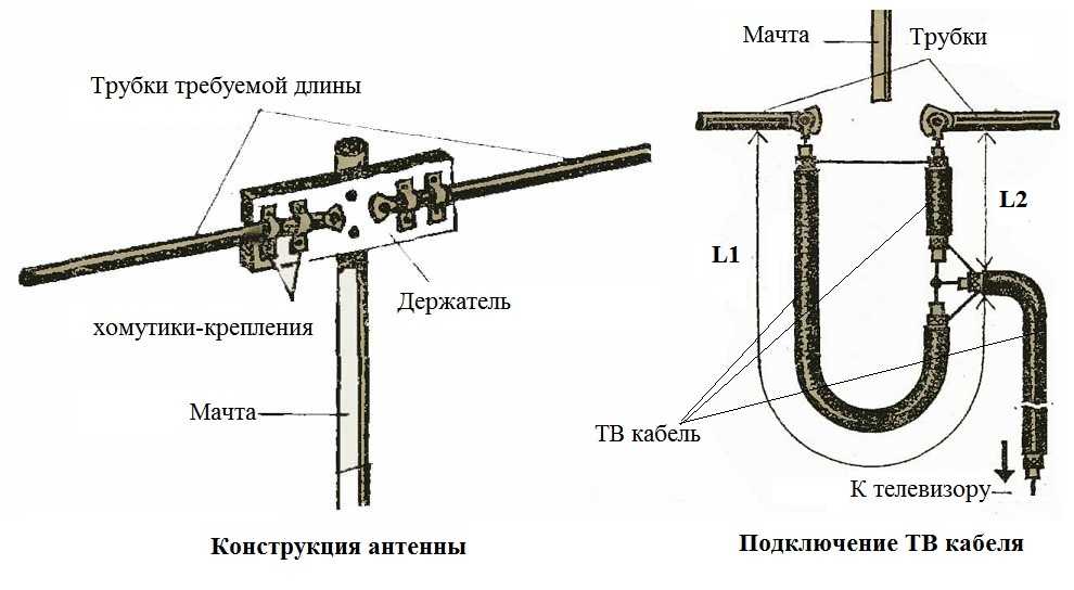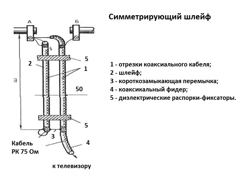 L'élément droit est une boucle, celui gauche raccourci est un feeder. Un câble de télévision est attaché à l'emplacement de leur station d'accueil. La longueur des segments est déterminée par le tableau en tenant compte de la longueur d'onde du signal.