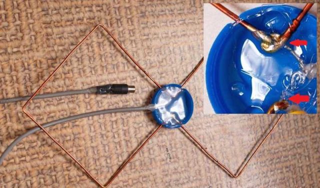 Le dispositif de l'antenne de télévision est très primitif - deux carrés / losanges attachés ensemble. Dans la version originale, le module Harchenko prévoit l'emplacement derrière les éléments figurés du réflecteur.