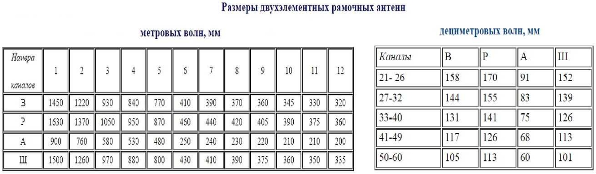 Les paramètres de fabrication des antennes de télévision à trame à deux éléments sont tirés du tableau. Les dimensions des éléments de travail dépendent du type d'ondes: décimètre ou mètre.