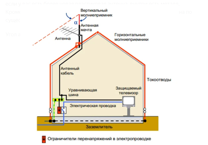 Je joins pour vous un schéma général de mise en œuvre de la protection contre la foudre d'un mât avec une antenne de télévision. Pour la mise à la terre, je recommande de prendre le fil PUGV 1x16mm2 et un câble galvanisé d'un diamètre de 8 mm. Beaucoup utilisent la barre, mais elle est assez problématique lors du processus d'installation. Si vous avez encore des questions, posez-les ici.