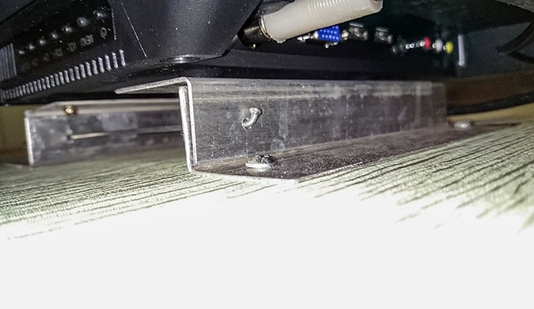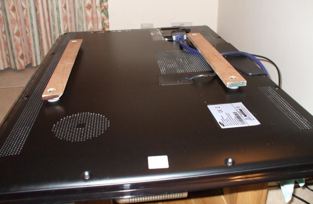 Prenez des sangles d'une longueur ne dépassant pas 10 à 15 centimètres, c'est-à-dire que leurs dimensions ne doivent pas dépasser la longueur du boîtier du téléviseur. La barre supérieure doit être légèrement plus épaisse que la partie inférieure, ce qui permettra une légère inclinaison de l'écran. Ensuite, sur la face supérieure de chaque barre, il est nécessaire de fixer deux vis avec un anneau.