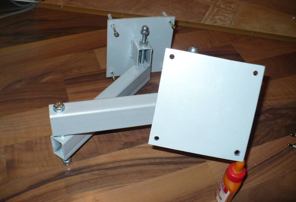 Pour une construction indépendante de la structure rotative-rétractable, vous aurez besoin de deux plaques métalliques, une section d'un tuyau carré, des boulons de raccordement, des vis, des chevilles. Tout d'abord, prenez deux assiettes de 20x20 cm, attachez-en une au mur et la seconde à l'arrière de l'appareil. Chaque plaque est équipée de deux coins métalliques.
