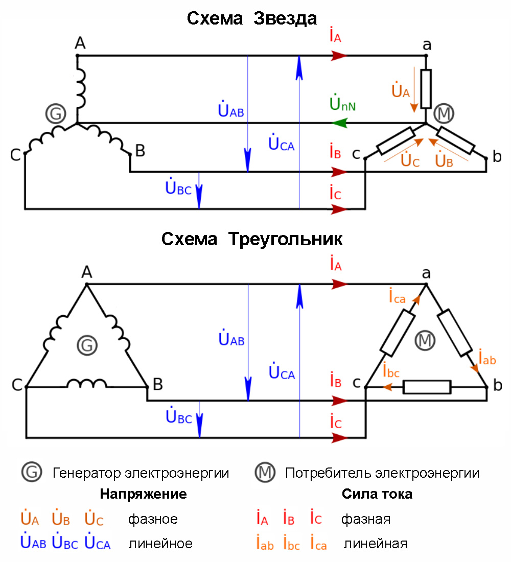 Lors de la connexion d'un type triangle, au contraire, la tension coïncide et les courants linéaires sont supérieurs à ceux de phase: