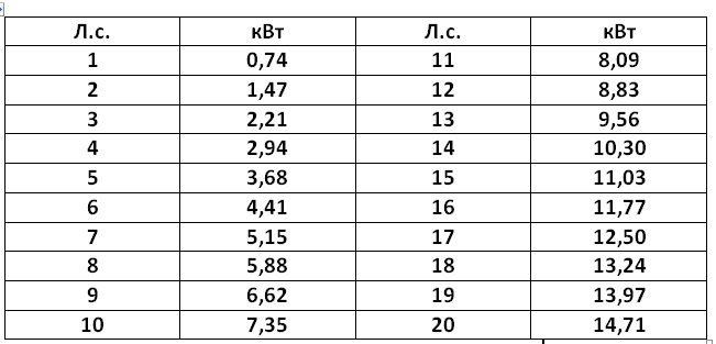 Valeurs numériques utilisées en pratique: 1 kW = 1,36 ch, 1 ch = 0,735 kW. Il est plus facile de travailler avec la première expression, et pour simplifier, 1,36 est arrondi à 1,4. Dans ce cas, l'erreur est faible et si nous estimons la puissance approximativement, alors sa valeur peut être négligée.