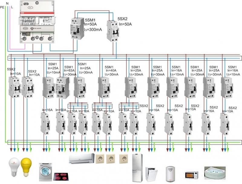Tous les plans et schémas sont similaires, car ils sont construits sur le même principe, cependant, ils peuvent différer par le nombre de prises et de circuits d'éclairage installés, et donc par le nombre de dispositifs de protection qui leur sont connectés.