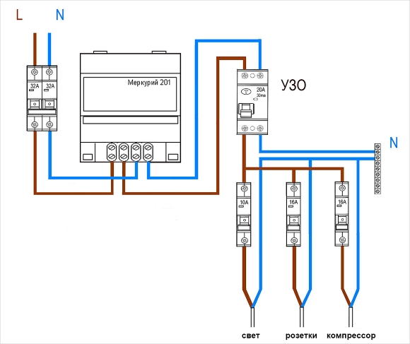 Si vous ne tenez pas compte du compteur, les disjoncteurs d'entrée, bus de terre, RCD 20 A, trois disjoncteurs resteront sur le tableau: sur la ligne d'éclairage, pour les prises et pour le compresseur. Des équipements puissants supplémentaires nécessitent également une protection automatique.