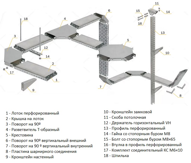 Pour le montage des plateaux, utilisez un kit de connexion spécial. Il vous permet de fixer plus solidement les éléments du système de câbles entre eux. Un ensemble de systèmes de suspension de fil peut comprendre un couvercle qui maintient de manière fiable le câblage à l'intérieur du canal de câble, même dans le cas d'une disposition verticale de l'itinéraire.