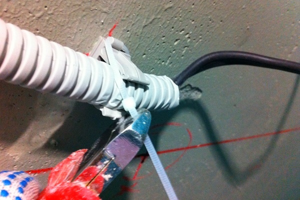 Après avoir terminé le tirage du câble électrique à travers le tuyau ondulé, nous procédons à l'installation du câblage: