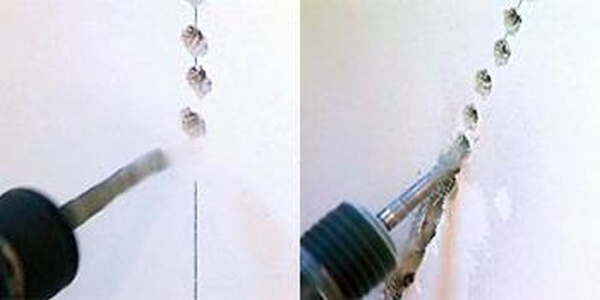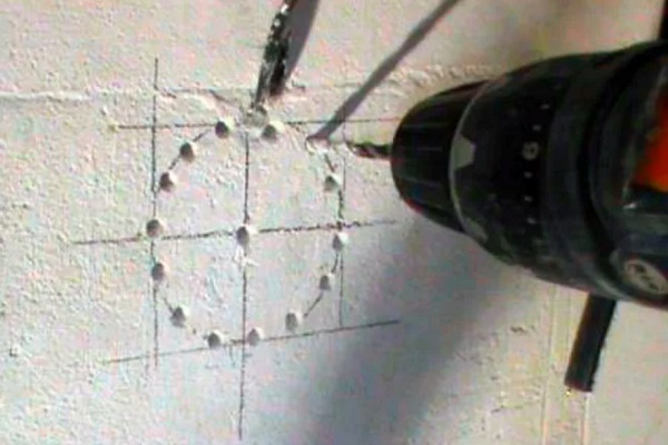 - Faites un "chemin de points" - percez des trous de la profondeur requise le long des lignes avec un intervalle d'environ 0,5 à 1 cm. En même temps, maintenez l'outil perpendiculaire au mur afin que le foret ne se plie pas ou ne se casse pas. Si vous avez besoin d'une large rainure, faites des trous en damier.