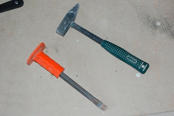La boîte à outils la plus simple qui se trouvera presque certainement dans les stocks de tout maître à domicile est un burin (burin) et un marteau. Nous plaçons le burin avec une arête vive sur le marquage dessiné, frappé avec un marteau pour pénétrer plus profondément dans le mur.