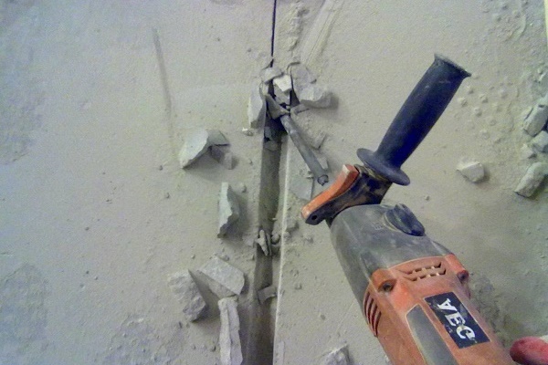 - Bulgare (meuleuse d'angle) - si vous équipez l'appareil d'un disque en diamant fritté ou turbo-diamant, il s'adaptera parfaitement à la réalisation de coups doux. Vrai travailler avec un broyeur assez poussiéreux et exigeant pour la précision - selon le marquage, vous devez couper 2 lignes parallèles en 2 passes, en maintenant un écart par rapport à la largeur du futur canal. Ensuite, le matériau est éliminé à l'intérieur de la rainure avec un perforateur avec une buse «spatule» ou un autre instrument à percussion.